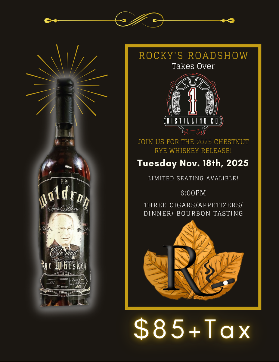Rocky's takes over Lock 1 Distillery. 2025 Chestnut Rye Release Party.